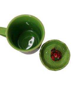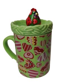 Mug Mathilda décor poule sur le repose sachet de thé en céramique très coloré base verte avec des décors de différentes couleurs.